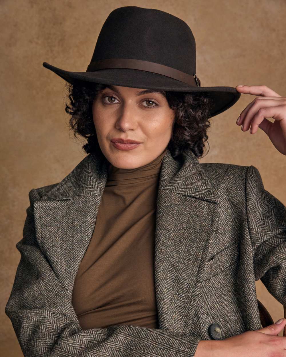 A super stylish wide brim felt fedora for town or country. Traditional hardwearing felt construction is water and crush resistant to retain shape and protect against elements.